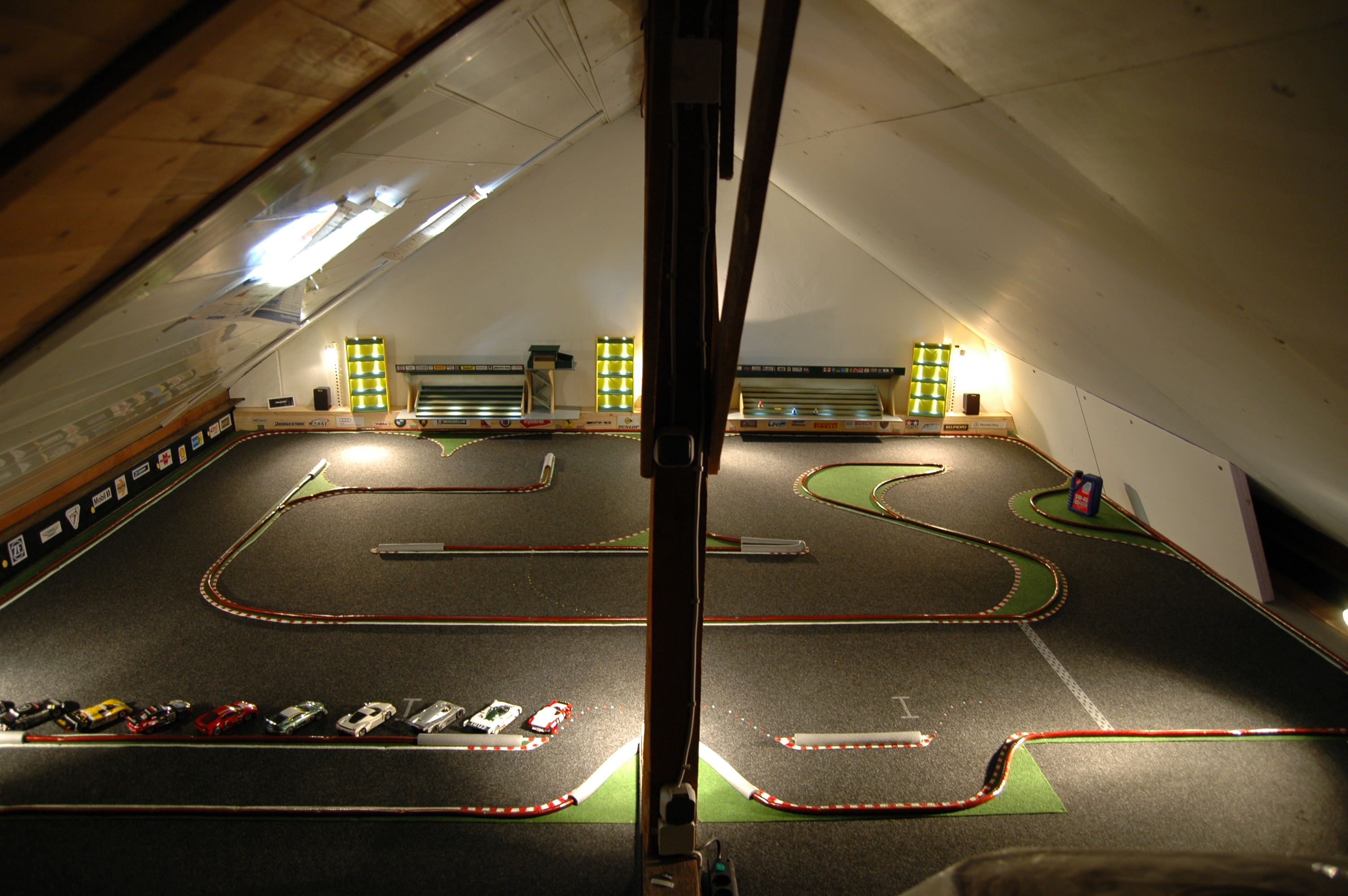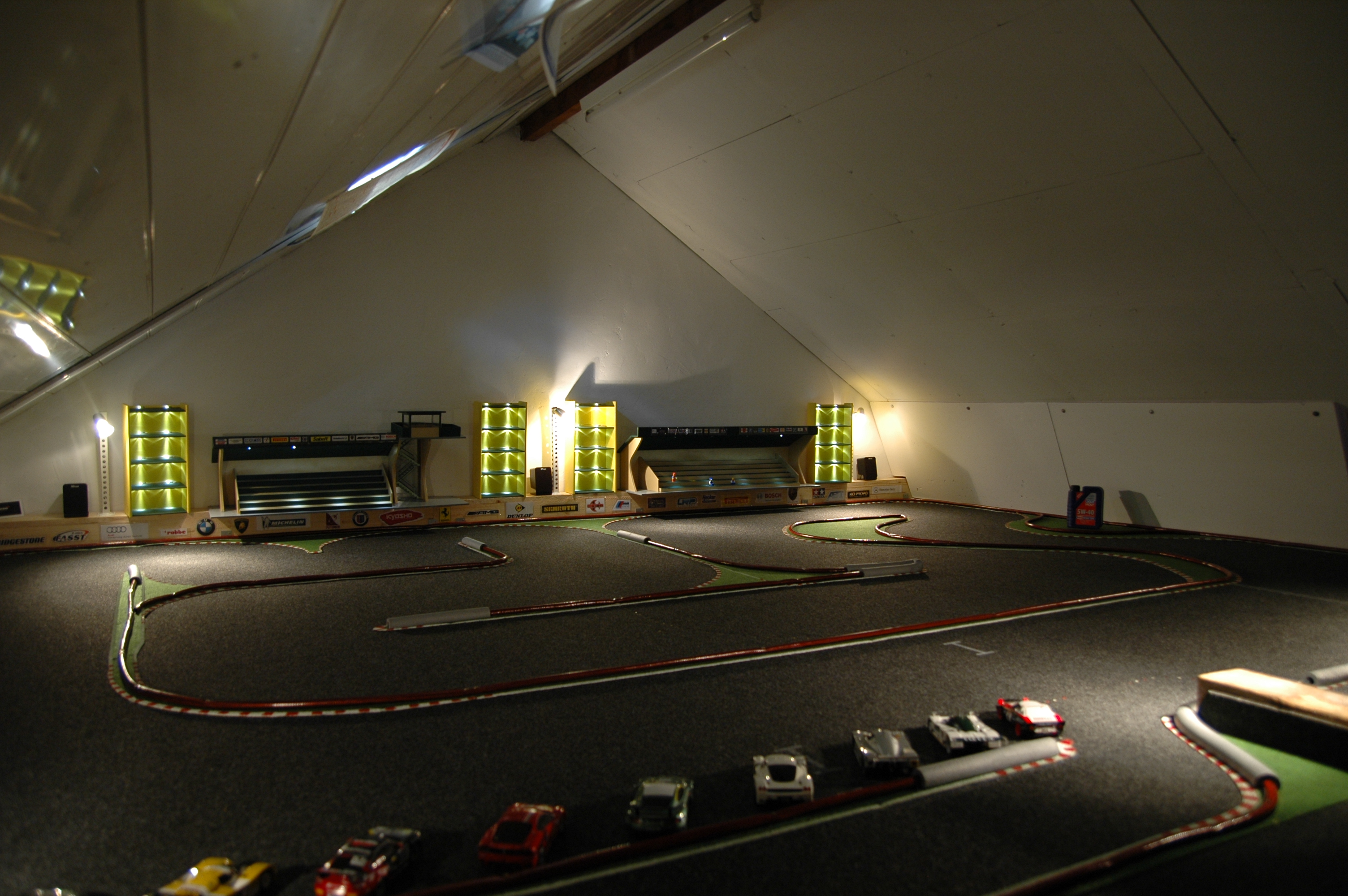 Mit Kreide und Klebeband wurde zuerst das Layout aufgezeichnet und untersucht, ob der Kurs flüssig durchfahrbar ist (Das ist wichtig für den Langzeit-Spielspaß). Nach einigen Modifikationen habe ich im nächsten Schritt Papierschablonen für das Grün angefertigt und dieses ausgeschnitten. Das Grün habe ich am Rand mit weißer Farbe bepinselt und in den Kurven mit Rot gestrichelt. Erst mit diesem Arbeitsschritt kam das Feeling einer Rennstrecke auf. Leider habe ich hier im Forum zu spät gelesen, dass man vorweg das Grün am Rand mit einem Rasierer bearbeiten sollte. Dadurch wird die Kante etwas niedriger. Als Banden dient weicher Gartenschlauch, der angeschraubt wurde. Im Nachhinein könnten die Banden etwas höher sein. Gerade bei den Gruppe C Fahrzeugen landet man im Rückwärtsgang immer wieder auf den Banden und kommt nicht von alleine wieder los. Die berechtigte Frage ist natürlich, wer fährt schon rückwärts? Antwort: Ich, und das immer wieder ;-). Nach einer Weile Training konnte man die Haupteinschlagspunkte ausmachen, die mit Rohrisolierung versehen wurden.