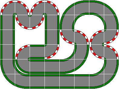 Kriterien waren aufgrund des geringen Platzes eine „relativ“ lange Gerade und entfernbare Schikanen um den Kurs auch für Anfänger, speziell meinen Kindern, fahrbar zu gestalten. Ferner sollte es auch Grünflächen geben, beispielsweise für die Brücke des Rundenzählers. Die Kurve unten links lässt sich nach etwas Übung mit Vollgas (Standardmotor) durchfahren, damit erhält man eine fast 8m lange Vollgas-Strecke. Mit recht wenig Aufwand lässt sich ein Rundkurs (auch für kleine Kinder interessant) aufbauen und kann nach und nach mit Schikanen und Kurven anspruchsvoller gestaltet werden.