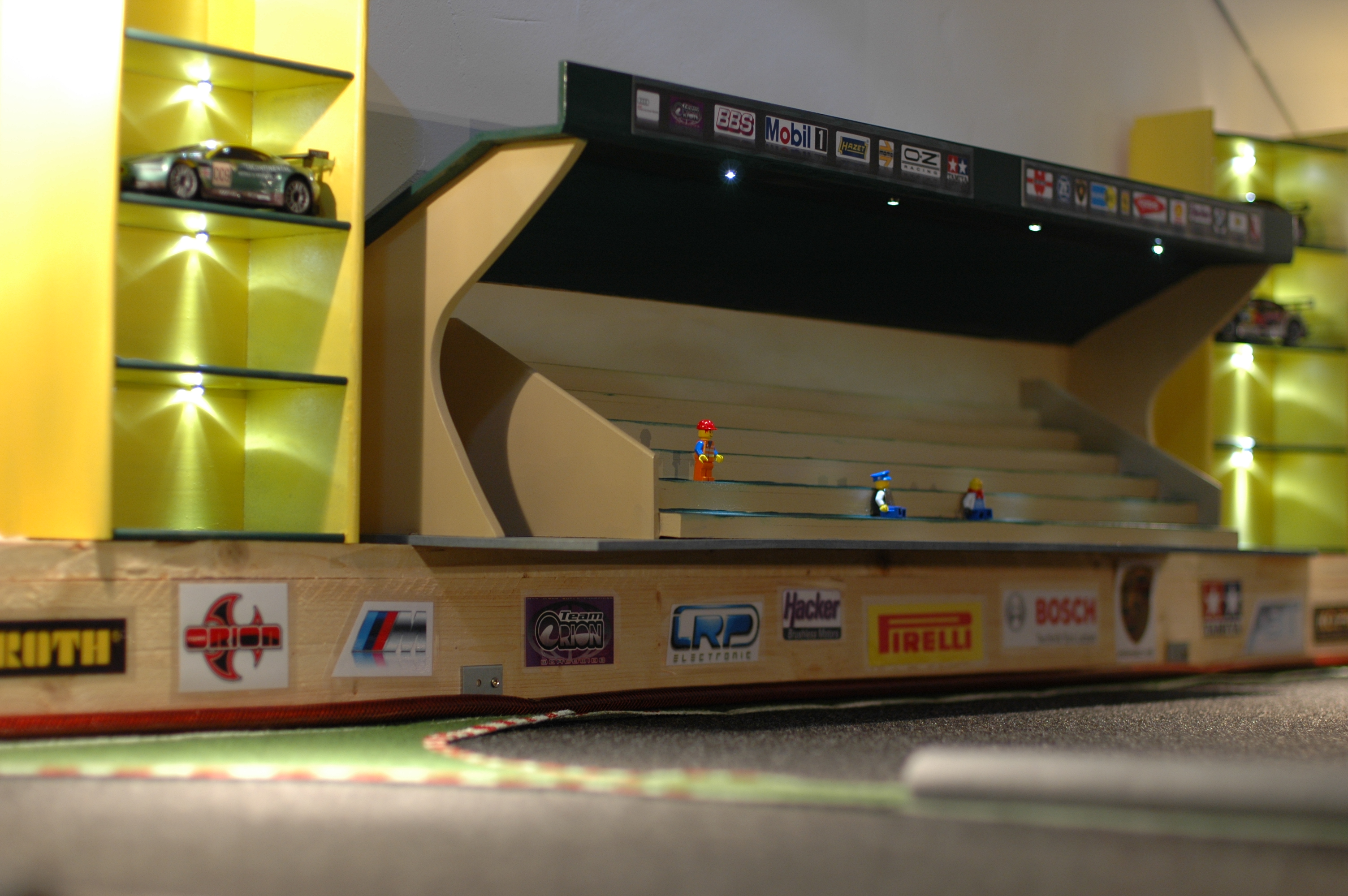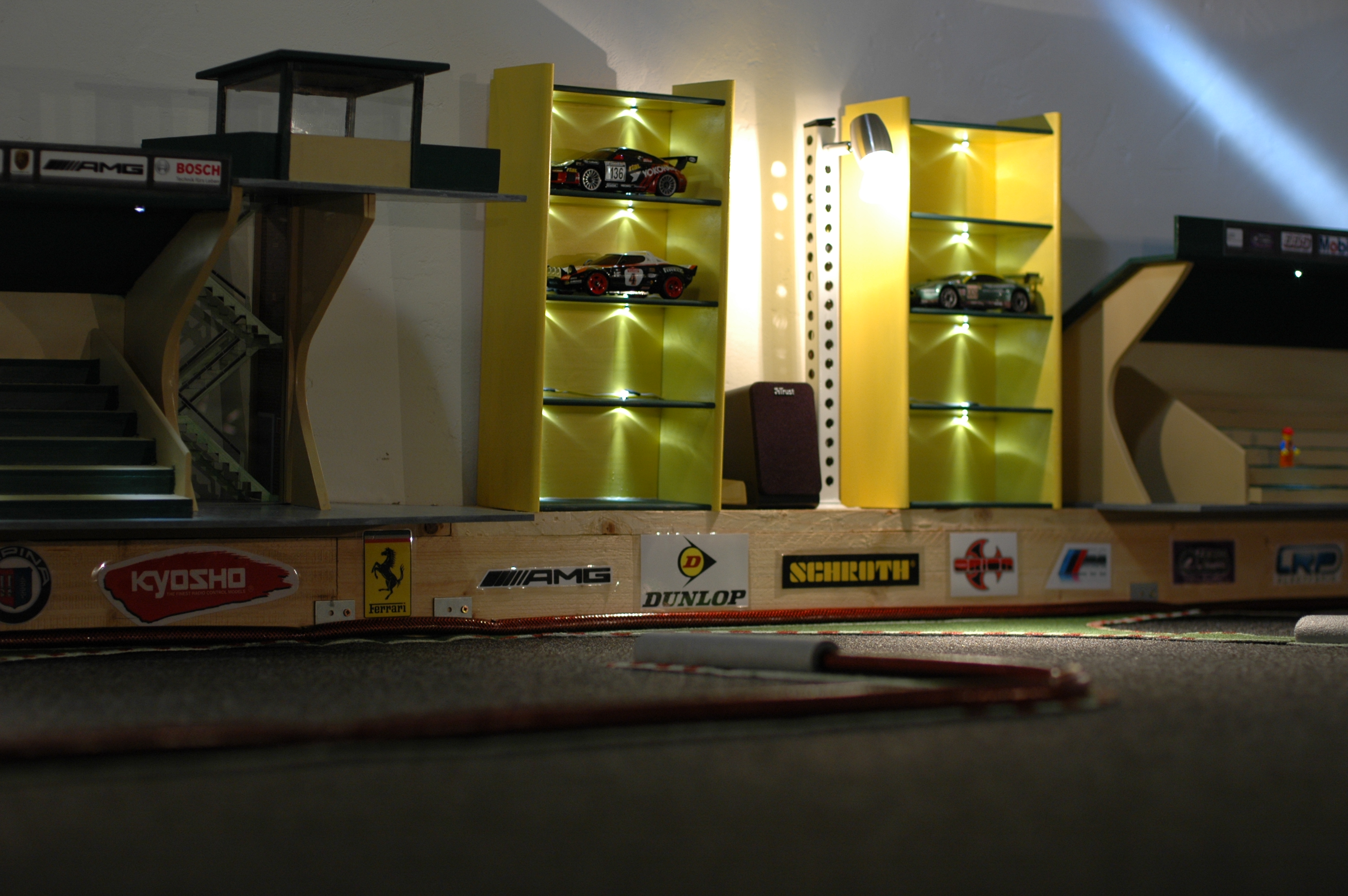 Irgendwo muss der Fahrzeugpark ja noch untergebracht werden, sodass ich 4 Vitrinen, Setzkästen oder Parkhäuser oder wie immer Ihr die Dinger nennen möchtet, gebastelt habe. Das Ganze mit LED’s versehen und schon leuchtet alles wunderbar. Als Leitungen habe ich aus dem Tiffany-Bedarf selbstklebende Kupferfolie verwendet.