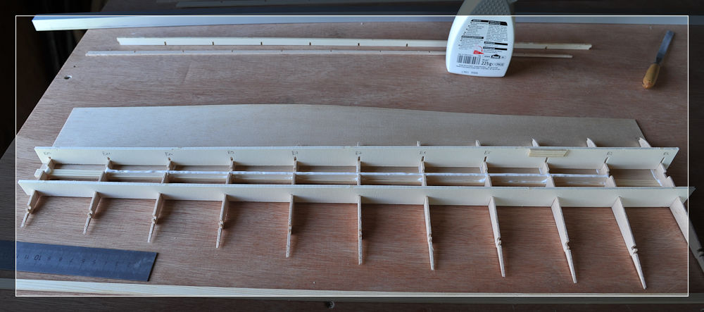 Der erste Schritt besteht aus der Aufdoppelung der Kiefernleisten. Im Anschluss daran, kann diese auf die untere vordere Beplankung geklebt werden: