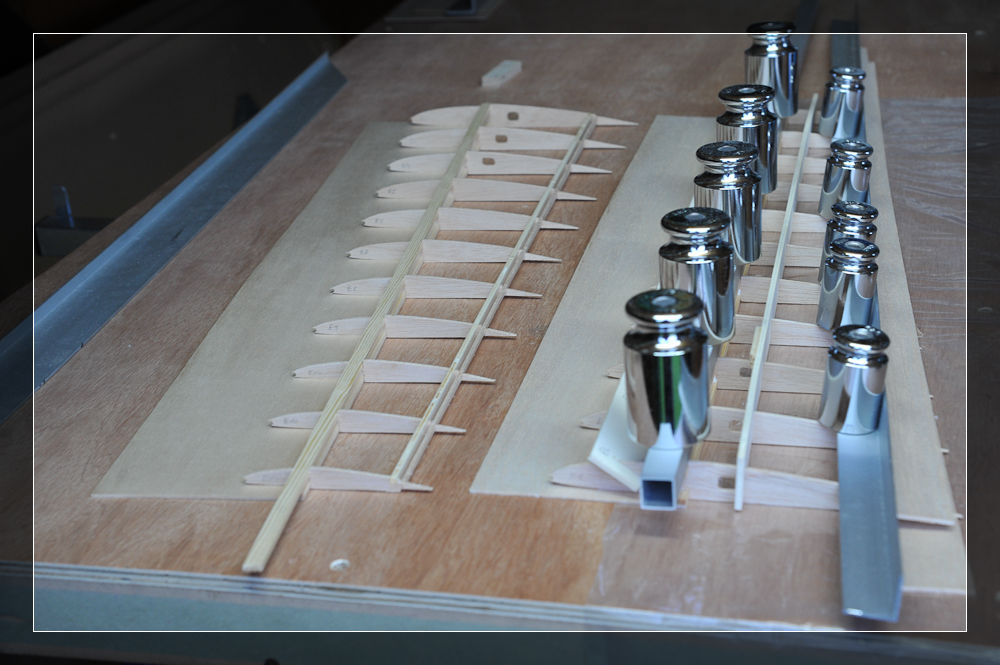 Bei den Außenflügel bin ich ein wenig anders vorgegangen. Ich habe nicht nur die Spanten eingeleimt, sondern auch gleich den Holmsteg plus oberen Holmgurt sowie die außenflügelseitige Flügelabschlussleiste und dem Querrudervorderholm. Damit stimmen die Abstände und Winkel 100%-ig.