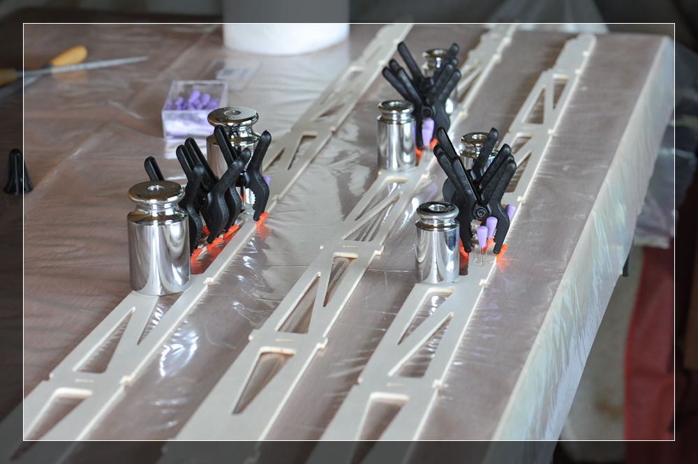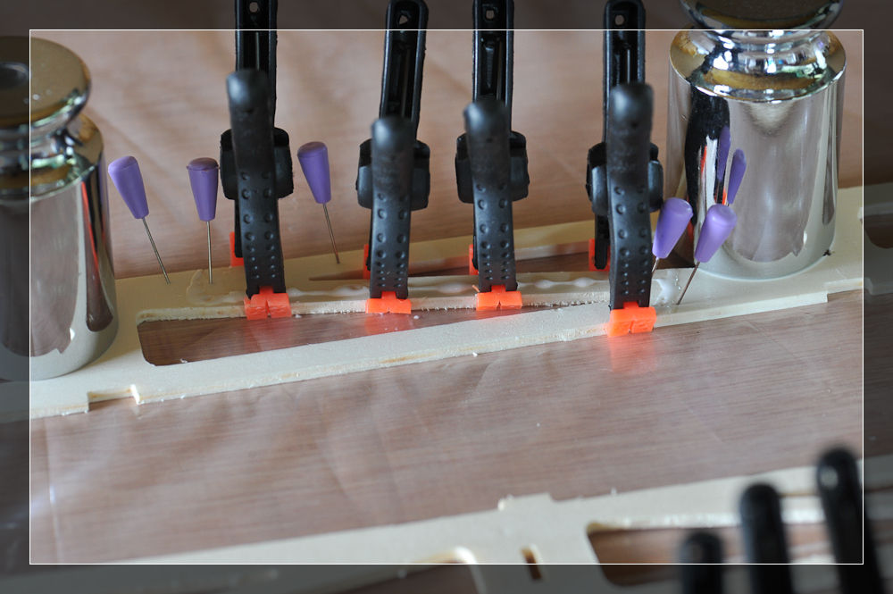 Hier nun meine erste Leimung. Mit Nadeln fixiert und Klammern gepresst. Am Besten entfernt man gleich den herausquillenden Leim. Das Schleifen ist sonst mühsam.