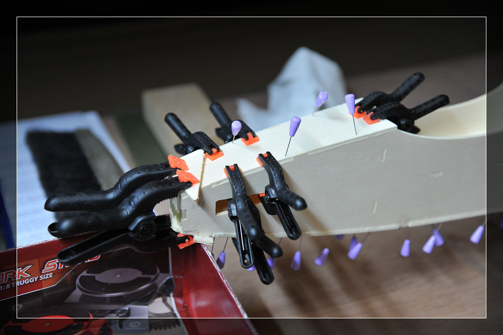 Die beiden unteren Rumpfbeplankungen kann man nicht so gut pressen, sodass hier nadeln zum Einsatz kommen. Durch die Rundung und Verzapfung war die Montage nicht so einfach.