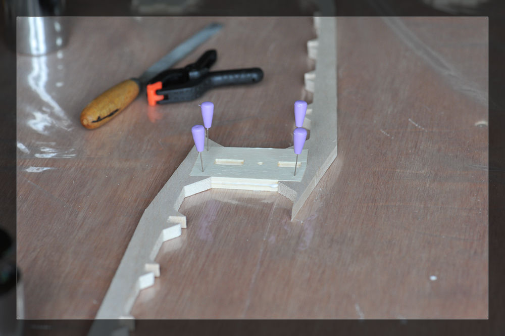 Beginnen wir mit dem Höhenleitwerk. Hier muss das Mittelstück, bestehend aus zwei Teilen, zusammengeleimt werden. Als Schablone habe ich die jeweiligen Einfassungen benutzt und mit den Nadeln fixiert. Im Anschluss ging das Ganze in die Presse.