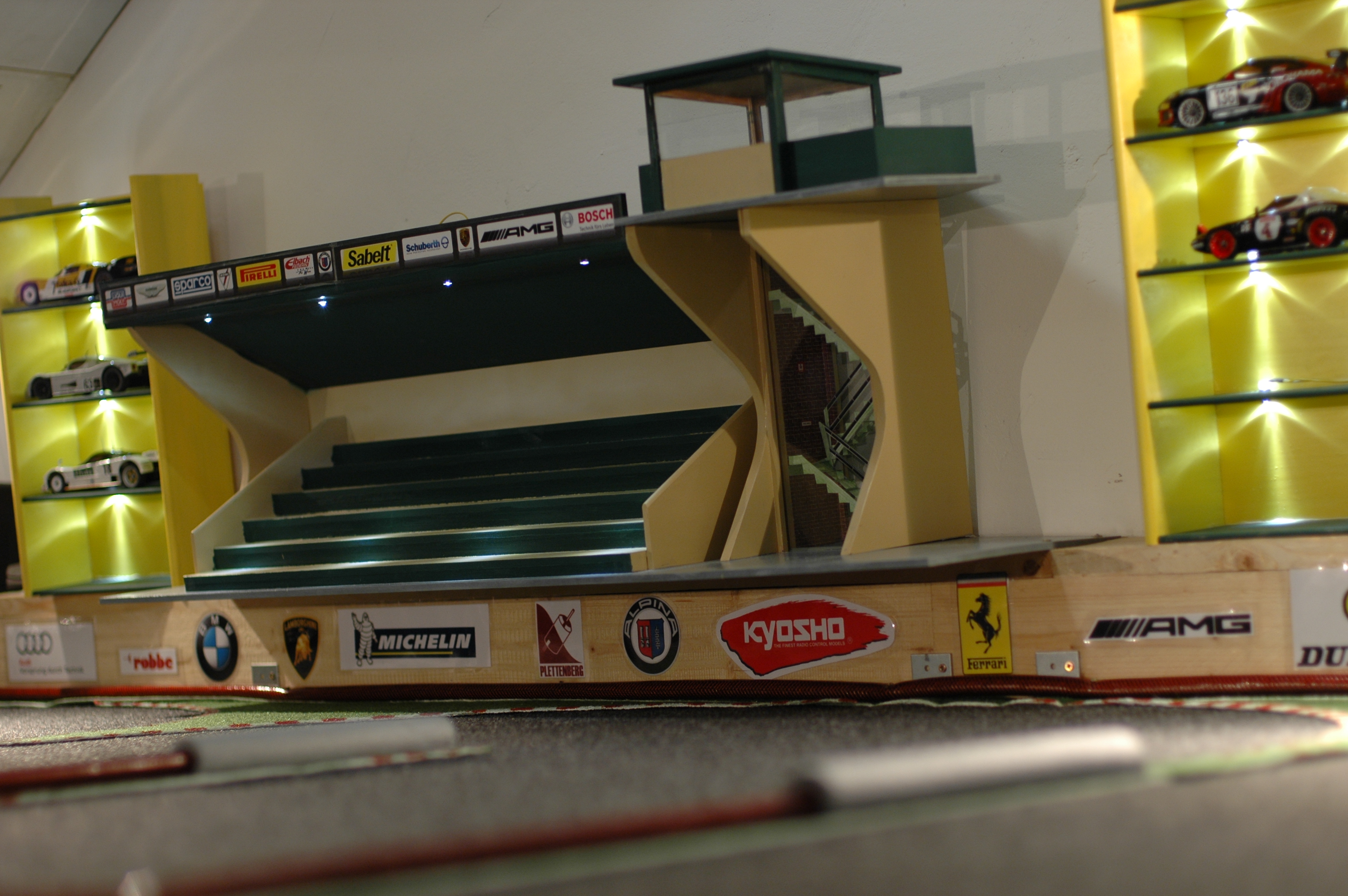 Im Bauabschnitt 3 wurde die Bandenwerbung angebracht. Mit Hilfe der Google Bilder Suche („Logo Firmenname“) gelangt man recht schnell zu guten Treffern. Diese Bilder wurden ausgeruckt, laminiert und angeklebt. Einiges an Zeit habe ich in den Tribünenbau gesteckt. Auf der Seite von carrera4fun.de gibt es einige Bauanleitungen aus Papier im Maßstab 1:32. Ich habe den Maßstab vergrößert, etwas vereinfacht und das Ganze aus Holz angefertigt. Es fehlen noch die Figuren, aber die Firma Frömter hat da einige gute Sachen im Sortiment. Leider nur im Maßstab 1:32.