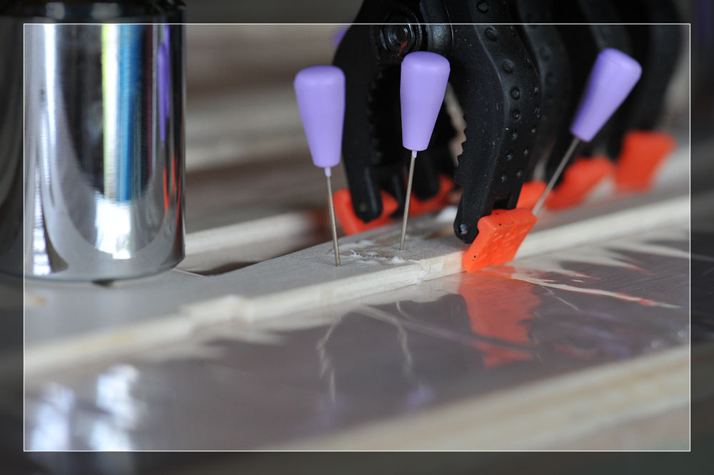 Hier nun meine erste Leimung. Mit Nadeln fixiert und Klammern gepresst. Am Besten entfernt man gleich den herausquillenden Leim. Das Schleifen ist sonst mühsam.