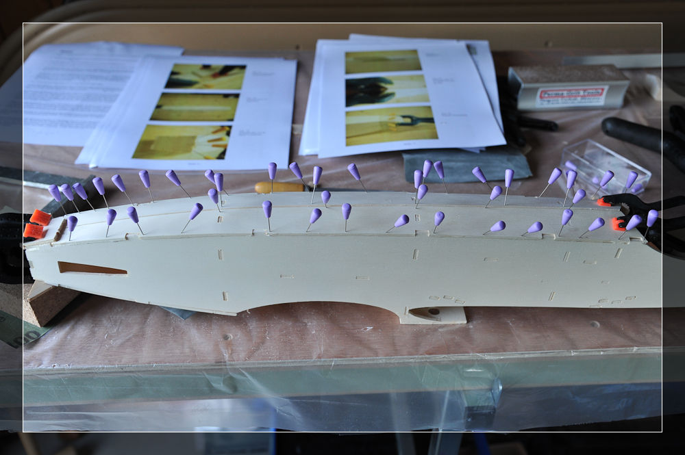 Die beiden unteren Rumpfbeplankungen kann man nicht so gut pressen, sodass hier nadeln zum Einsatz kommen. Durch die Rundung und Verzapfung war die Montage nicht so einfach.