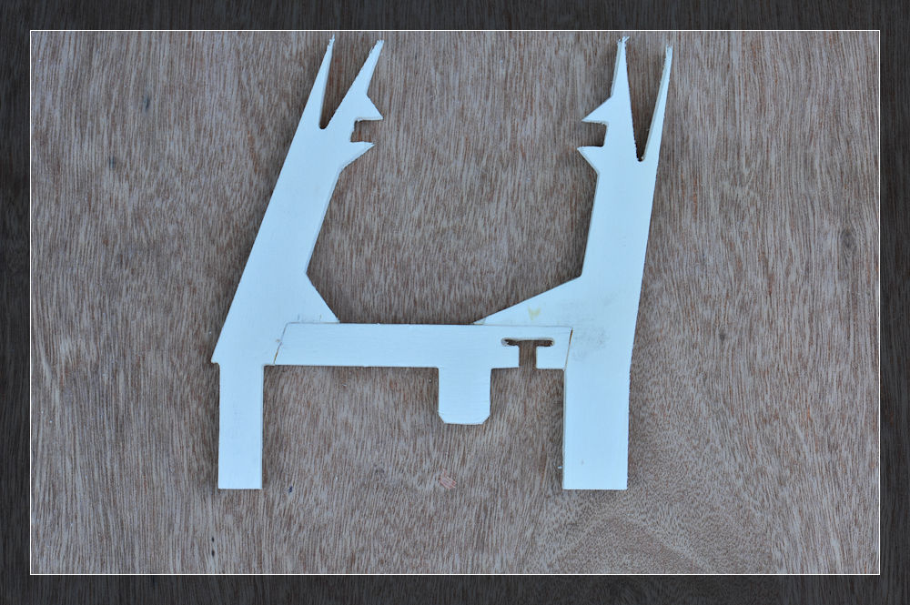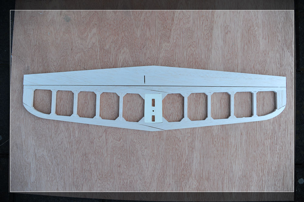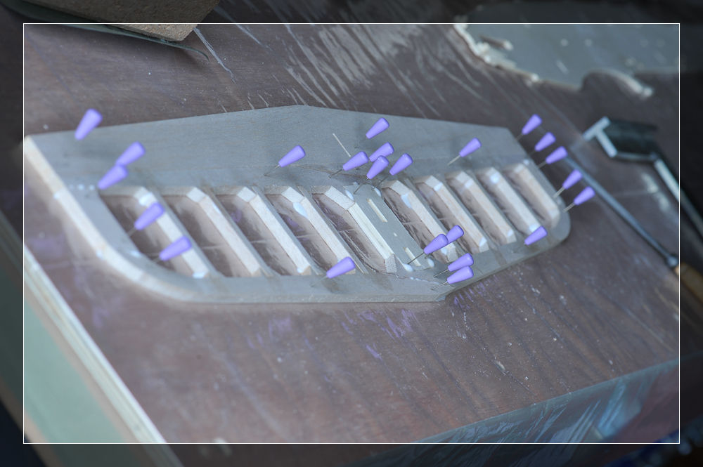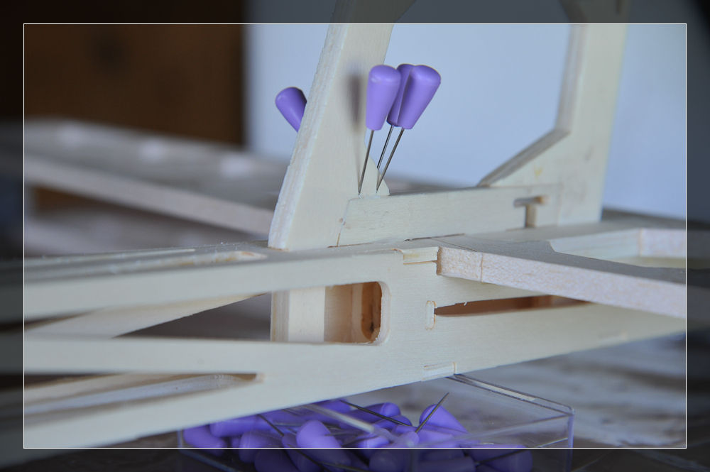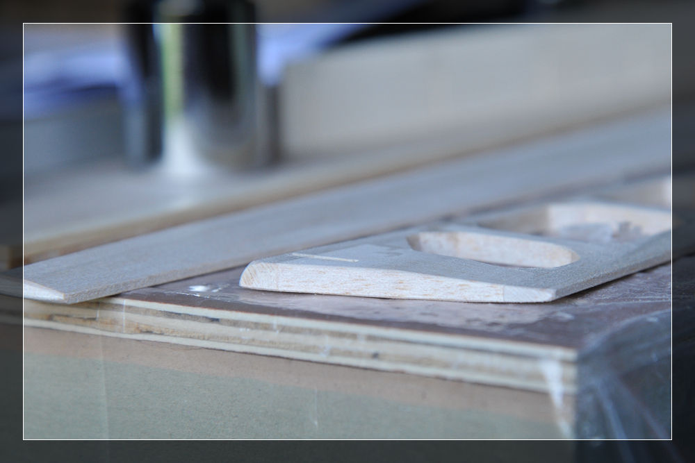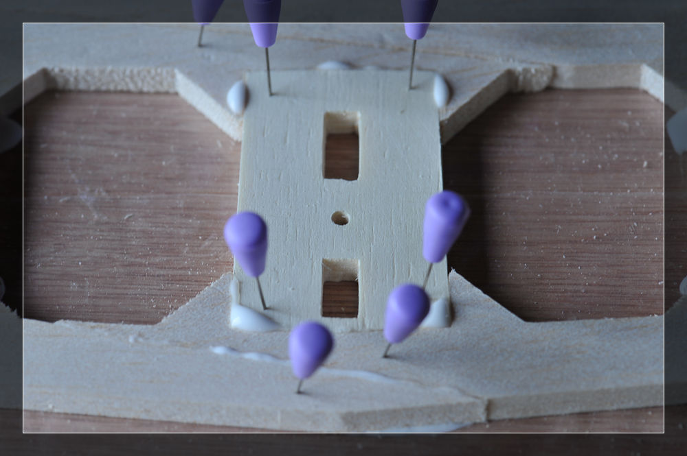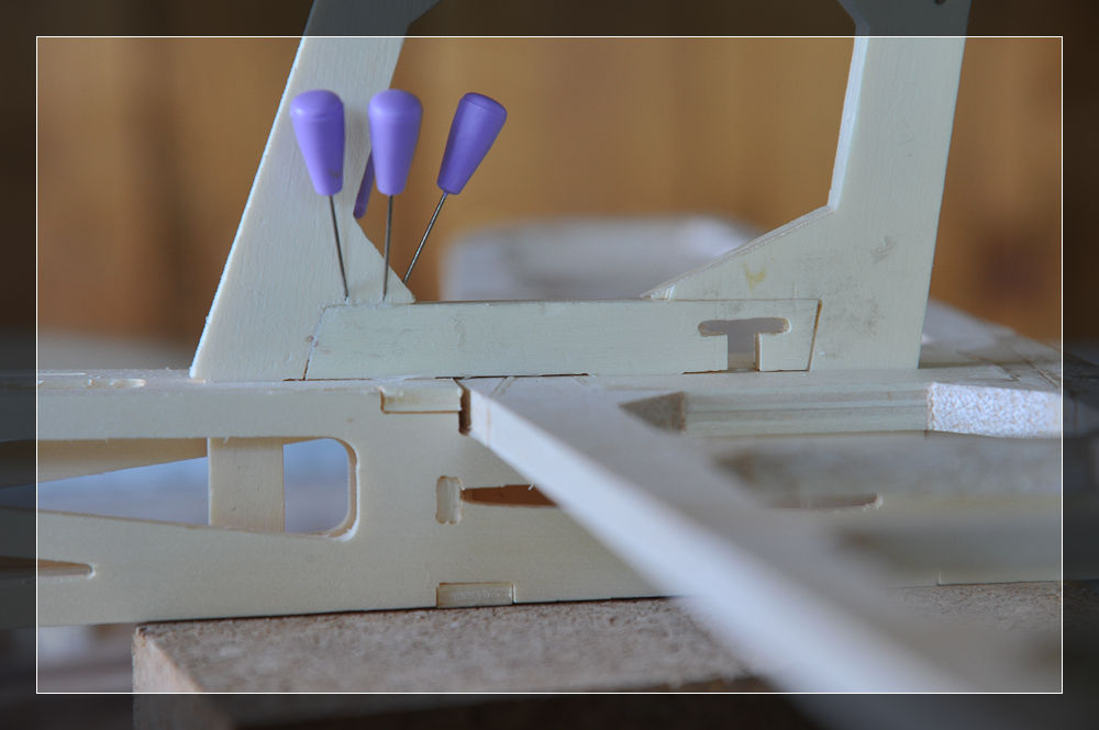 Beginnen wir mit dem Höhenleitwerk. Hier muss das Mittelstück, bestehend aus zwei Teilen, zusammengeleimt werden. Als Schablone habe ich die jeweiligen Einfassungen benutzt und mit den Nadeln fixiert. Im Anschluss ging das Ganze in die Presse.