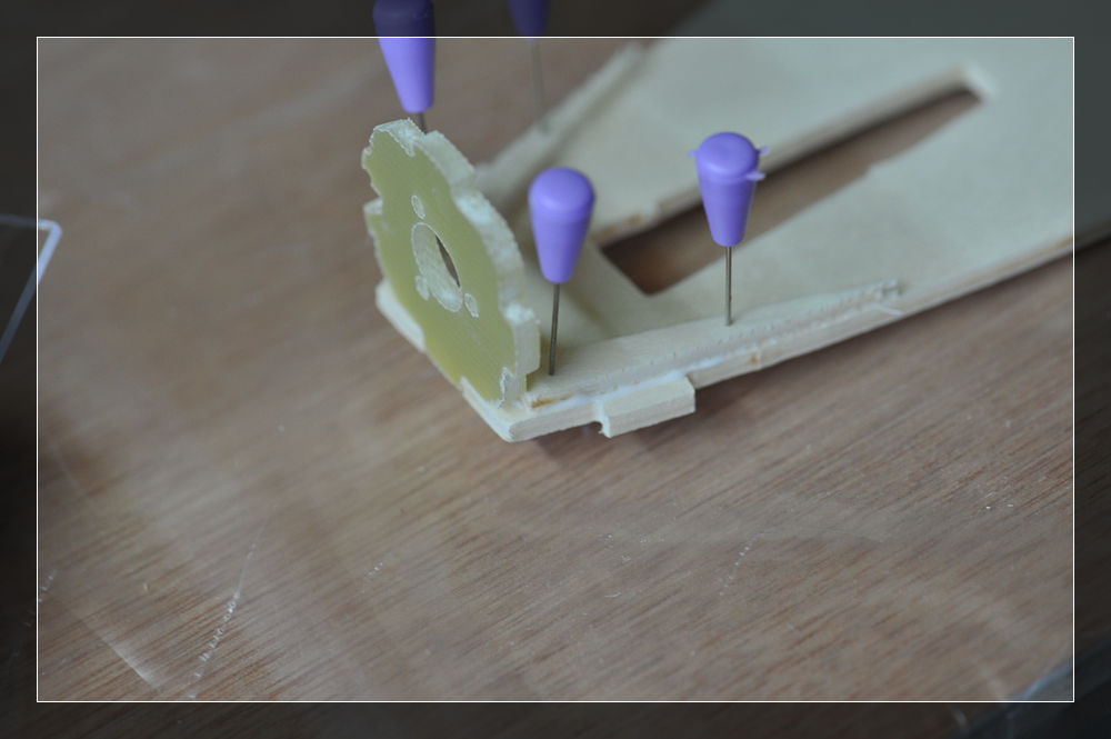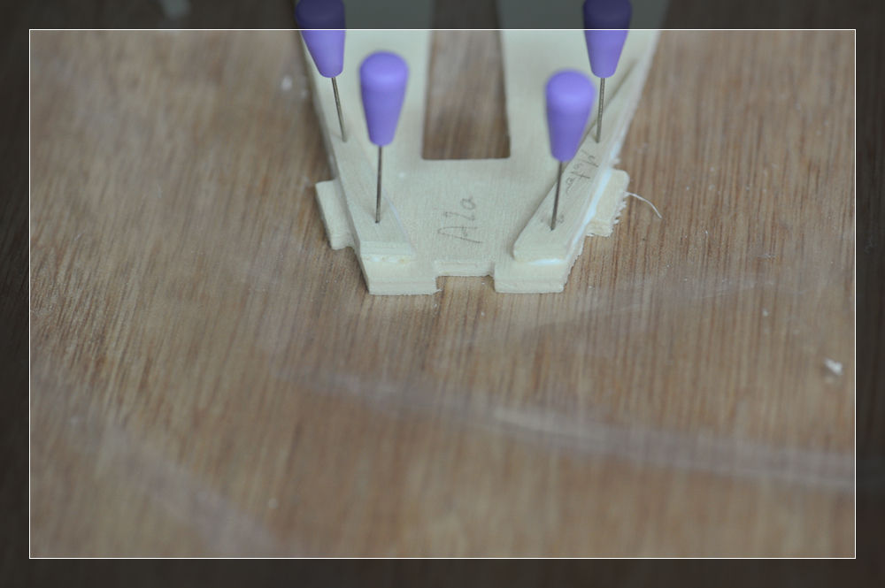 Nach dieser Vorbereitung kann auf dem Rumpfboden Spant für Spant verleimt werden.  Nicht wirklich spektakulär, dennoch können hier Missgeschicke auftreten. Dazu aber später mehr. Die Seitenwand wird hier als Schablone benutzt.